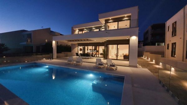 Moderná novopostavená luxusná vila v atraktívnej lokalite v blízkosti pobrežia/pláže, ostrov Pag (trajektové a mostné spojenie)